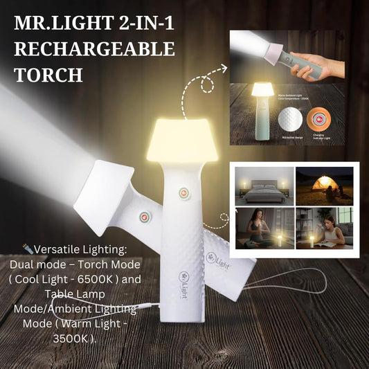 Mr.Light 2-in-1 Rechargeable Torch / Emergency Lantern, Li-ion Battery, Type-C, Brightness Adjustment, Warm & Cool Lights, Charge Indicator, for Gifting, Camping, Indoor & Outdoor Usage MRGD007